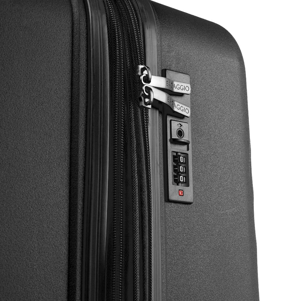 Mala Cartagena, feita em polipropileno resistente, combina durabilidade com um design moderno de textura em relevo. Equipada com rodas duplas 360° removíveis, que facilitam a locomoção e podem ser retiradas em voos, oferece transporte ágil e prático. Possui cadeado embutido, zíper expansível para ampliar a capacidade, alças de mão superior e lateral e suportes que permitem apoiar a mala em esteiras ou balcões sem risco de danificar o acabamento. Por dentro, traz divisórias com zíper, elásticos e bolsos organizadores para manter seus pertences seguros e no lugar durante toda a viagem.